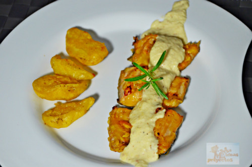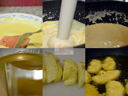 Rebozamos los gajos de manzana que habíamos reservado y los lomos y los freimos en aceite abundante y bien caliente, primero la manzana y por último los lomos, trituramos la crema de manzana