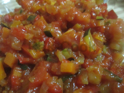 Preparamos la salsa de verduras. En una cacerola con dos cucharadas de aceite añadimos los tomates troceados, los vamos machacando con la espátula hasta obtener una salsa semiespesa. Lo pasamos por el chino para eliminar pepitas y piel. Reservamos. Cortamos en brunoise todas las verduras y en dos cucharadas de aceite de oliva vamos pochando, primero el pimiento, después añadimos las zanahorias, seguimos rehogando unos minutos tras los cuales integramos el calabacín y por último la cebolla, cuando ésta comience a ponerse transparente vertemos la salsa de tomate y un pelín de agua. Dejamos reducir a fuego lento hasta que quede una salsa espesita. Incorporar la sal y el azúcar en los últimos minutos de cocción y rectificar a gusto. Dejamos enfriar del todo.
