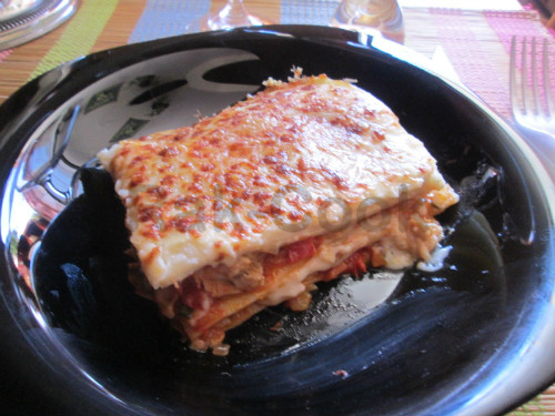 Vamos precalentando el horno, sacamos la lasaña de la nevera y partimos con un cuchillo grande las porciones a servir. Vertemos la bechamel y bien de queso parmesano. Gratinamos hasta que nos dore bien el queso. Si deseais ver mas fotografías del proceso id al siguiente enlace: http://rak-cook.blogspot.com.es/2013/08/lasana-de-verduras-atun-y-queso-brie.html