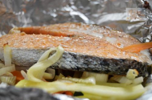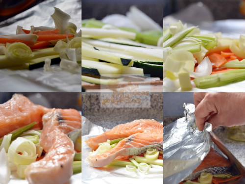 Cortamos todas la verduras en juliana y las colocamos sobre un papel de aluminio ( una lamina de alunimio grande por cada rodaja de salmón), repartiéndolas según los comensales que vayamos a ser en mi caso dos, colocamos una rodaja de salmón, rociamos con el vino blanco y chorrito de aceite y cerramos hermeticamente el papel de aluminio de la siguiente manera