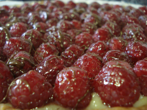 Por último. Rellenar la base de la tartaleta de masa quebrada con una capa de la crema pastelera e ir decorando con las frambuesas toda la tarta. Con un palillo y untando el chocolate y haciendo hilos para decorarla. Por ultimo con la cobertura transparente para postres disuelta en agua untar bien las frambuesas para que queden brillantes . Enfriar y servir.