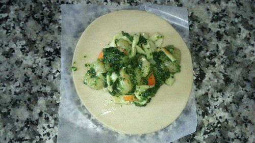En una sarten con aceite añadir las espinacas descongeladas, las gambas y el surimi y cocinar a fuego medio.