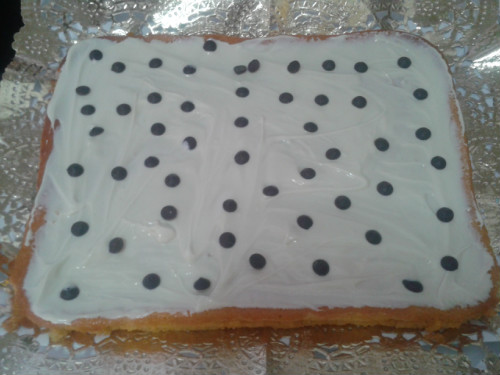 Una vez fria, puedes decorarla con chocolate blanco y pepitas de chocolate, guardará unas horas en la nevera .