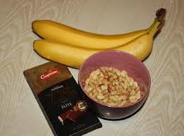 Fundir el chocolate a baño maría, y partir los plátanos por la mitad, con palítos de madera colocarlos en cada mitad añadir las golosinas deseadas y enfriar.