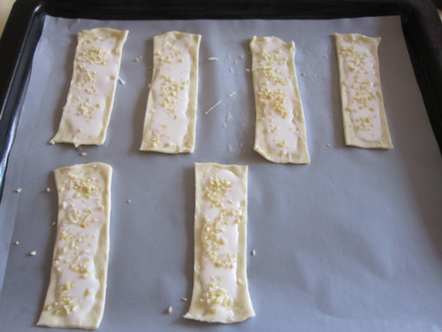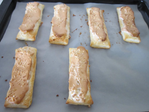 Una vez echo esto, las vamos colocando sobre papel de horno en una bandeja,les echamos por encima la glasa blanca, con ayuda de un pincel o una cuchara, y las espolvoreamos de cubitos de almendra. Las metemos en el horno, precalentado, a 200 º , y las tenemos unos 15 minutos,mas o menos, depende de vuestro horno.