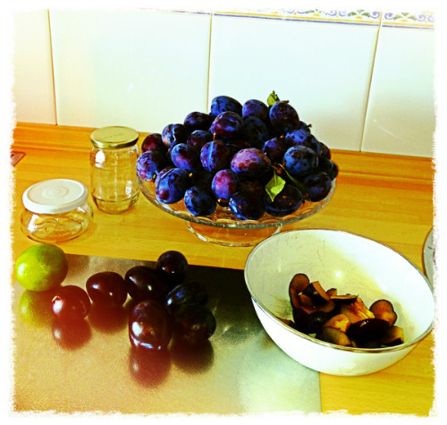 Para la mermelada, preparamos las ciruelas lavándolas bien, partiéndolas a la mitad y deshechando el hueso. Las ponemos en un cazo y le añadimos el azúcar; revolvemos bien y dejamos reposar en la nevera unas dos horas