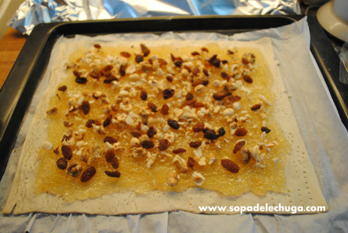 extender el hojaldre y pincharlo con un tenedor para que no suba. (Si se hace con una sola lamina cubrir solo la mitad con el cabello de ángel). Esparcir por encima del cabello de ángel las pasas y las nueces y avellanas partidas.