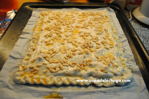 Doblar la mitad vacía por encima de la parte rellena y hacerle un retorcido al borde para sellarlo. Pinchar nuevamente por encima con un tenedor. Batir la yema de huevo y pincelar la coca por encima. Esparcir por encima piñones a gusto (aprox. 30 g). Volver a pincelar con cuidado con la yema y meterla al horno hasta que este dorada. Aprox. 10-15 min.