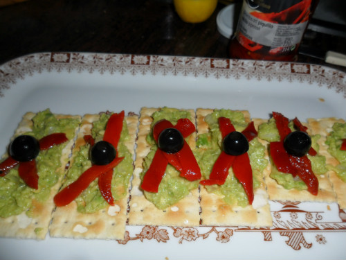 se extienden en una bandeja los crackers o panecillos tostados, se vacía el aguacate y se mezcla aplastándolo con un tenedor con la cebolla, muy picada, se rocía con zumo de limón, y luego se decora con los pimientos del piquillo en tiras y las aceitunas, se guarda en la nevera para que esté fresco antes de comer