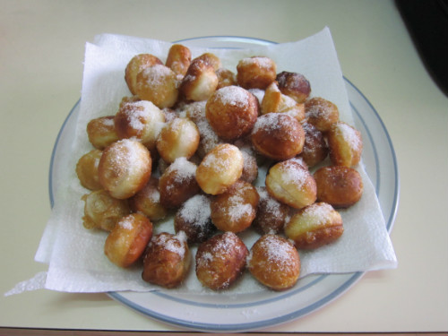 Seguidamente, los vamos colocando en un plato, o , donde querais. Los vamos friendo en abundante aceite, bien caliente. Ponemos papel absorvente, en un plato , y cuando hinchen y esten dorados, los sacamos de la sarten y los ponemos sobre el papel absorvente, para que suelten el exceso de aceite.Se espolvorean con azucar, en calientes.