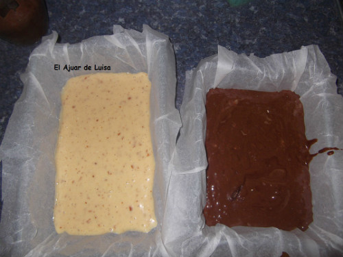 A una de las partes le añadimos la pasta de chocolate y las horneamos por separado. No tengo dos moldes para hornear iguales, pero lo ideal sería tenerlos y cocer la masa en recipientes iguales.