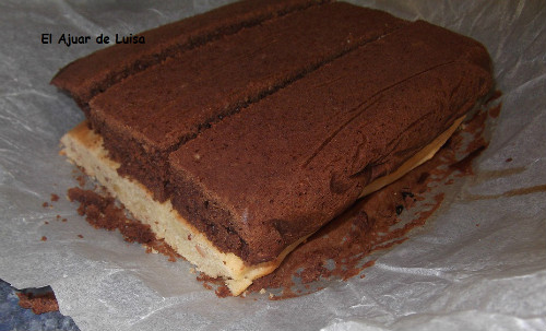 Una vez sacados del horno y desmoldados, ponemos uno encima de otro y les recortamos los bordes para que queden iguales y lisos y los cortamos en 2, 3 o 4 trozos iguales longitudinalmente (depende de la anchura del bizcocho, este que hice solo daba para 3 trozos). Calentamos la mermelada un poco en el microondas -sabor al gusto, yo he utilizado de fresa- y con un pincel de cocina la untamos entre los trozos a modo de pegamento y vamos alternando los colores.
