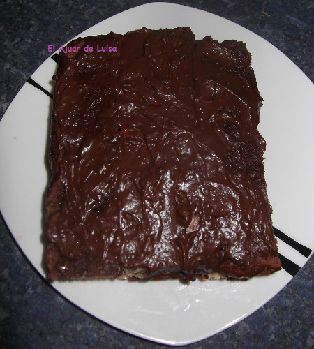 Una vez hecho esto, podemos cubrirlo con chocolate espeso: se calientan unos 150 ml de nata y se le añade cacao soluble y una cucharada de mantequilla. Se aparta del fuego antes de que hierva y se deja enfriar un poco antes de cubrir el bizcocho con él.
