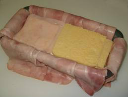 Untar un molde rectangular con mantequilla, y hacer deslizarse el azucar por ella, se ira pegando poco pero suficiente para darle un toque dulce, luego cubrir con lonchas de jamón dulce el molde, sin sobreponer las lonchas solo para que queden unidas lo justo.