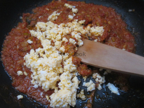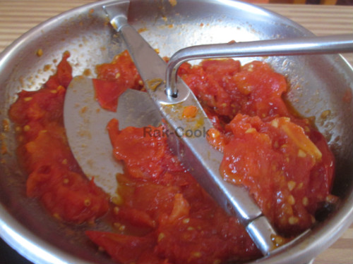 Troceamos los tomates y los vamos friendo en un poco de aceite de oliva a fuego medio. Vamos machacando con la cuchara de madera. Lo pasamos por el chino para eliminar piel y pepitas. Aderezamos con sal y miel para la acidez a gusto siempre y reservamos. Sobrará tomate. Ponemos también el huevo a cocer.