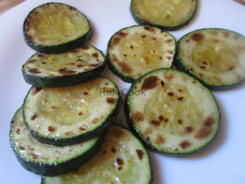 En una sartén muy caliente a fuego vivo añadimos unas gotitas de aceite de oliva y sal y vamos haciendo a la plancha el calabacín cortado en rodajas. El punto final de este plato se realiza con soplete, para quienes no tengáis, en vez de montar el plato directamente donde se vaya a servir lo pondremos en una bandeja antiadherente apta para el horno sobre la cual montaremos las milhojas para después gratinar y caramelizar el azúcar.