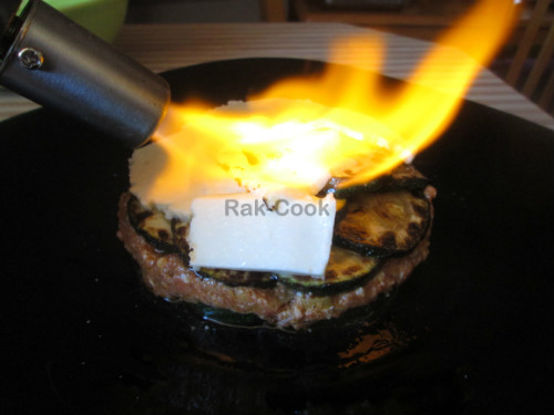 Vamos sacando las rodajas de calabacín y ayudándonos de un molde redondo comenzamos el montaje. Una capa de calabacín, relleno y otra capa de calabacín, sobre la cual ponemos unas tiras de queso y espolvoreamos azúcar moreno por encima. Aplicamos el soplete hasta que nos quede el queso fundido y el azúcar caramelizado. Servimos inmediatamente.