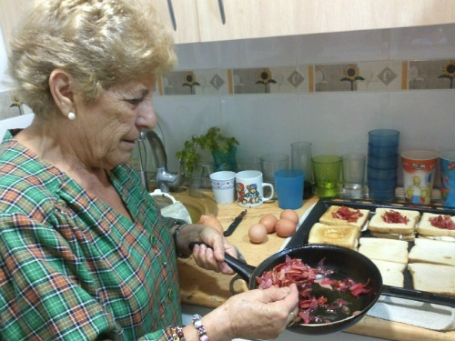 Sacamos las rebanadas del an y en la entera colocamos, en el centro, un montoncito del fiambre y encima un huevo frito.