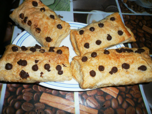 Se precalienta el horno a 180º arriba y abajo y mientras tanto se desenrrollan las planchas de hojaldre y se cortan en rectángulos como si fueran un libro. Se echa en una parte del hojaldre el cabello de ángel y se ponen dos pastillas de chocolate blanco encima. Se cubren con la otra parte, doblándolo bien pero sin llegar a cerrar de todo. Se pinta el hojaldre por encima con un poco de aceite de oliva, Se pegan las chips de chocolate como más os guste y se espolvorea con azúcar.