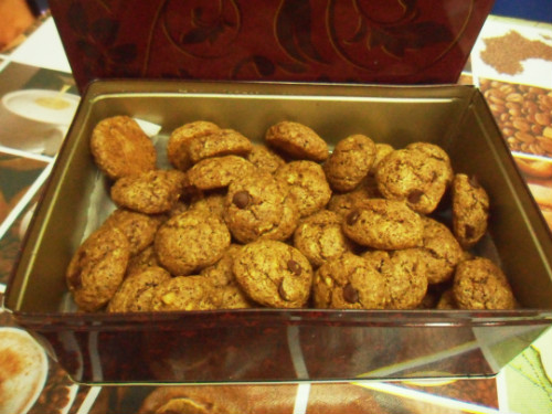 Una vez batido,Se mezcla la harina, la avena, la sal y el bicarbonato.Y se mezcla con la anterior masa.Se le agregan las nueces trituradas.