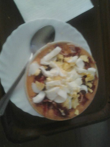 Lo primero que hay que hacer es escaldar o pelar los tomates, seguidamente, se trocean los tomates, los pimientos limpios y sin pepitas, el ajo y el pepino, el pan lo tenemos reservado en un bol sin corteza y cubierto de agua, lo escurrimos bien de agua y lo echamos en el cuenco de la batidora junto con los tomates, pimientos, pepino, ajo, aceite, vinagre y sal y lo batimos todo bastante hasta que quede todo bién triturado. Lo servimos en tazones, cuencos de barro, platos... espolvoreando por lo alto con una pizca de pimienta, atún, taquitos finos de jamón y huvo duro. ¡¡¡BUÉN PROVECHO!!!