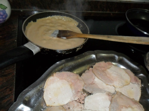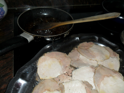 se pasan las tajadas de lomo por la sartén, vuelta y vuelta y se reservan mientras se prepara la salsa de jeréz, para ello, en una sartén se pone la cucharada de mantequilla y se derrite,