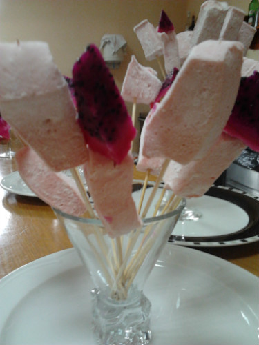 Las de la foto están presentadas en brochetas adornadas con un trozo de pitahaya roja en la punta.