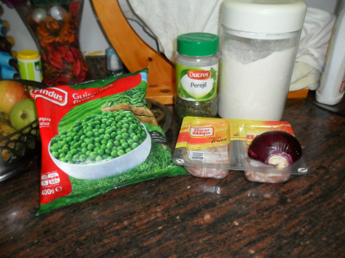 poner a hervir, agua con sal y cuando hierve echar los guisantes y la cebolla muy picada, mientras cuecen un cuarto de hora o 20 minutos