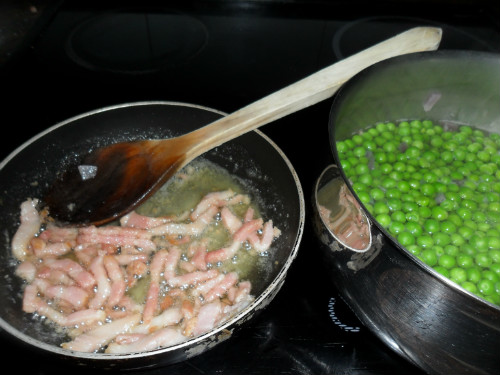 mientras cuecen los guisantes, en una sartén se echan las 2 cucharadas de aceite, sofreir el bacón 3 minutos, añadir la harina espolvoreándola sin dejar de remover y sofreir para que no sepa a crudo, agragarlo a la cazuela de guisantes y tapar dejando cocer otros 10 minutos por lo menos, hasta que espese un poco el caldo. Servir caliente