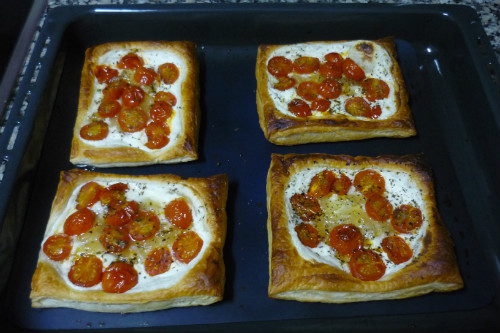 Ponemos un poco de queso en cada tosta, dejando un borde de hojaldre que pintaremos con leche. Después echamos un poco de la confitura de cebolla y añadimos los tomatitos por encima. Finalmente añadimos orégano al gusto.