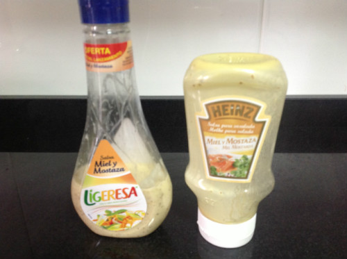 -Se puede elegir la salsa al gusto. A mi me gusta la de miel y mostaza. He probado Heinz y Ligeresa; me gustan ambas, quizá más la de Heinz y el tipo de dosificador me parece mejor también.