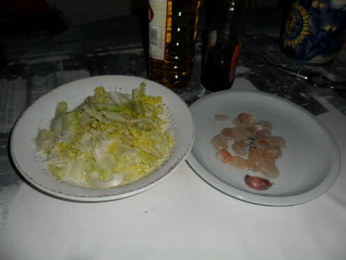 lavar y escurrir la escarola, mejor usar las hojas centrales, lavar también las gambas peladas y pelar el ajo