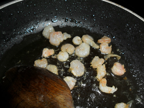 en una sartén con dos cucharadas de aceite, dorar el ajo y sacarlo, echar las gambas y removerlas hasta que estén echas.