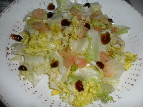 una vez echas las gambas se añaden a la escarola, se le echan unas cuantas gotas de vinagre de módena y ya están listas para comer
