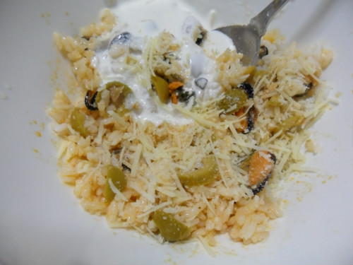 Se mezcla el arroz, con la lata de mejillones en escableche,las aceitunas troceadas, el queso rallado y las cucharadas de nata líquida para cocinar.