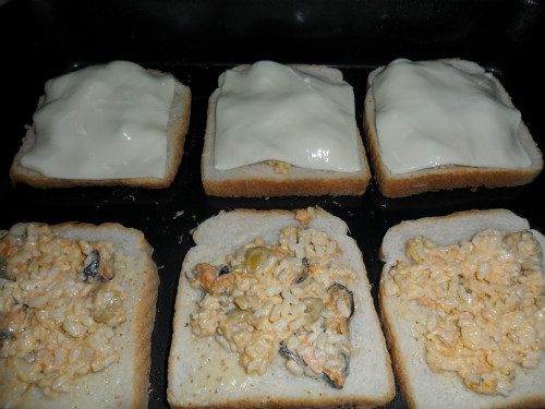 poner las rebanadas de pan de molde en una bandeja refractaria para el horno, repartir la mezcla de arroz por las rebanadas, y colocar encima de cada una de ellas una loncha de queso, meter al horno precalentado a 180º 10 minutos hasta que se funde el queso