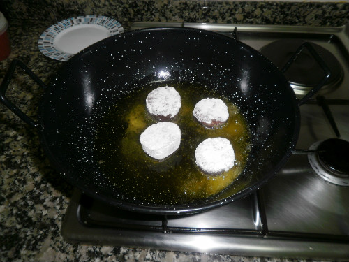 Cortamos la 1/2 morcilla en rodajas y la freímos pelada y enharinada para que no se nos deshaga; una vez frita la retiramos en un plato para añadirla al final