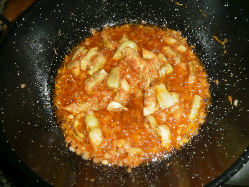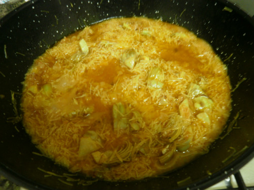 A continuación freímos las alcachofas seguido de la cebolla (troceada o rallada como más os guste) y por último añadimos el tomate triturado. Cuando ya tenemos este sofrito listo ponemos los fideos finos y les damos un par de vueltas con el sofrito.