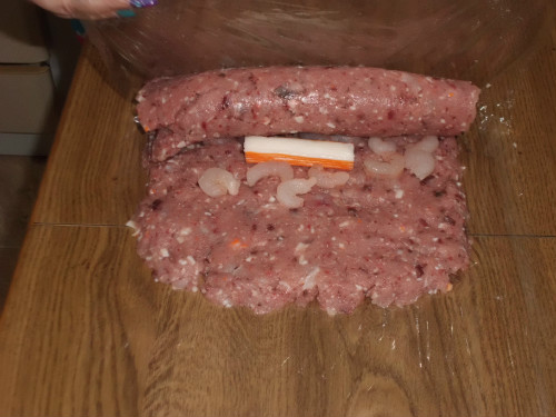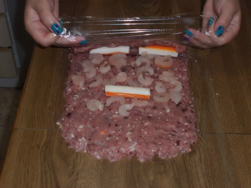 Pon por encima las gambas restantes y los palitos de cangrejo y enrrolla