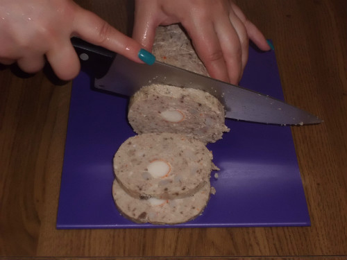 Limpia el Bonito de piel y espinas y pícalo muy menudo, pica 30 gr de gambas y 3 palitos, mezclalo en un bol con la clara de huevo, sal y pimienta