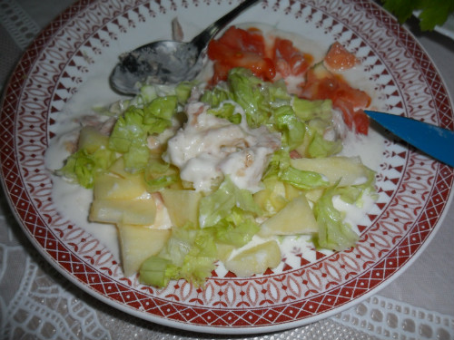 se mezcla la pulpa del tomate, con la manzana cortada en trocitos, las hojas de lechuga troceadas, la lata de atún, la mahonesa y la nata líquida.
