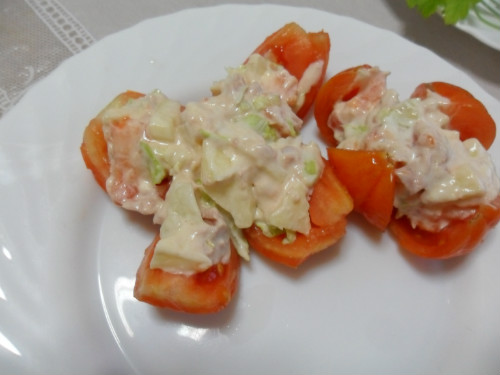 se hacen dos cortes profundos en forma de cruz en cada tomate sin llegar a la base, se vacía la pulpa