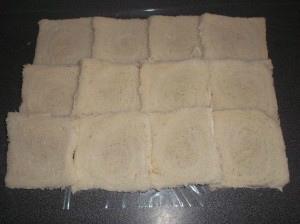 .-Preparamos un trozo de film transparente sobre la mesa, y a continuación pondremos las rebanadas de pan de molde encima (tenéis que ponerlas de manera que quede un trozo de rebanada encima de otra).