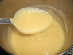 .-En un cazo al fuego (medio) echaremos: 4 yemas huevos, la ralladura de un limón, 125gr de azúcar, 40gr de harina y