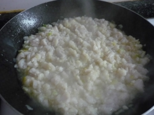 Añadir a la cebolla cuando esté casi hecha. Hacer hasta que se consuma todo el agua que suelta el pescado.