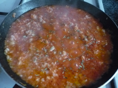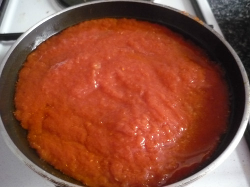 Pelar los tomates, cortar pequeños y freir en una sartén con un poco de aceite, sal y azúcar para quitar la acidez.