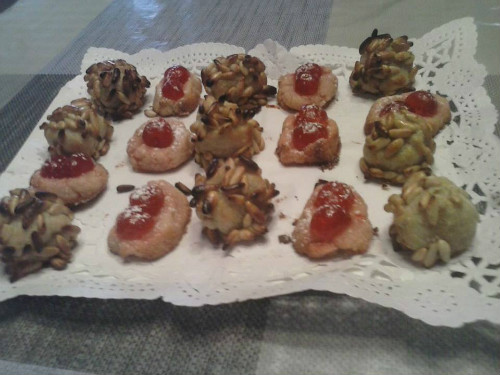de piñones, untamos con huevo la masa, y los pasamos a los piñones que se peguen, los de almendra igual forma, los de coco añadiremos la masa y los pasaremos por el coco no necesita huevo, los de fresa aplastaremos con el dedo, y pondremos la guinda , y asi sucesivamente de café,limón,membrillo, y al final se pasa todos los panallets una pincelada de huevo y al horno que hemos tenido pre calentado los ponemos unos 4 minutos, a 180 grados y buenísimos