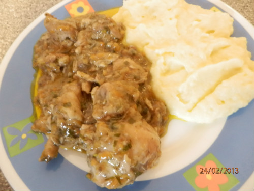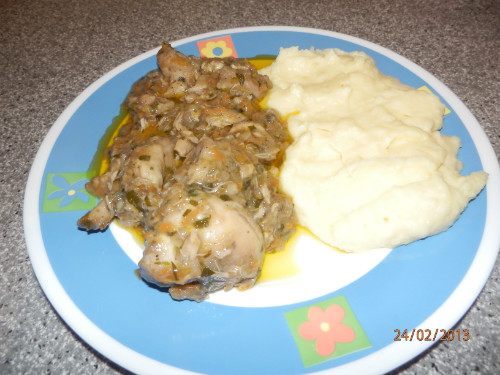 Preparación de Conejo en salsa ce los cazadores con pure´ de patatas.: