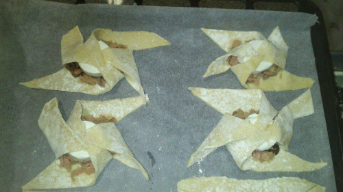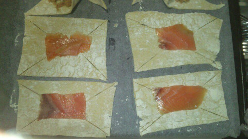 Estirar la plancha de hojaldre un poco y dividirla en 8 cuadrados.