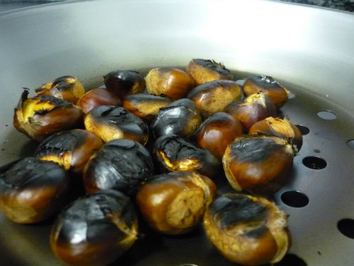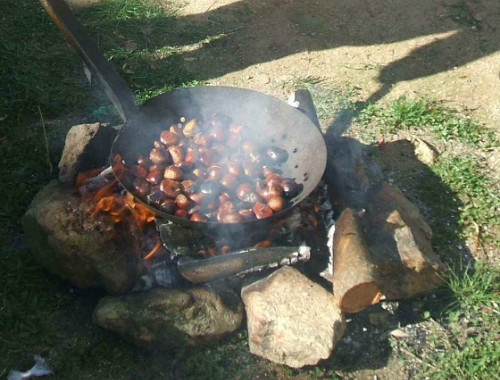 Hacemos una pequeña lumbre u hoguera, en un sitio adecuado, como por ejemplo la chimenea de casa, en una sartén agujereada ponemos las castañas con cáscara y en la llama introducimos la sartén con las castañas dándoles vueltas hasta que estén más bien las pieles negritas.